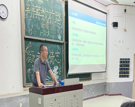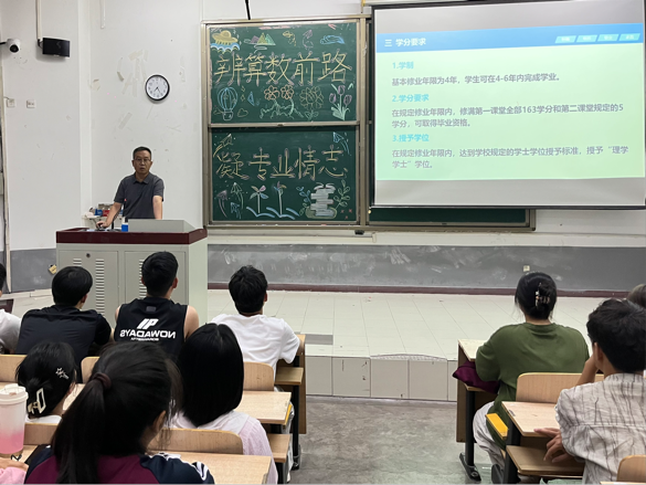 为了让2025级数学与应用数学专业新生快速建立专业认知,准确把握学科方向和课程体系、明确学习目标,营造积极的学习氛围,数学与计算科学学院于2025年9月11日晚在南院第六阶梯教室开展“辨算数前路,凝专业情志”主题教育活动,活动特邀副院长刘庆辉老师主讲,2025级全体数学与应用数学专业新生参会。