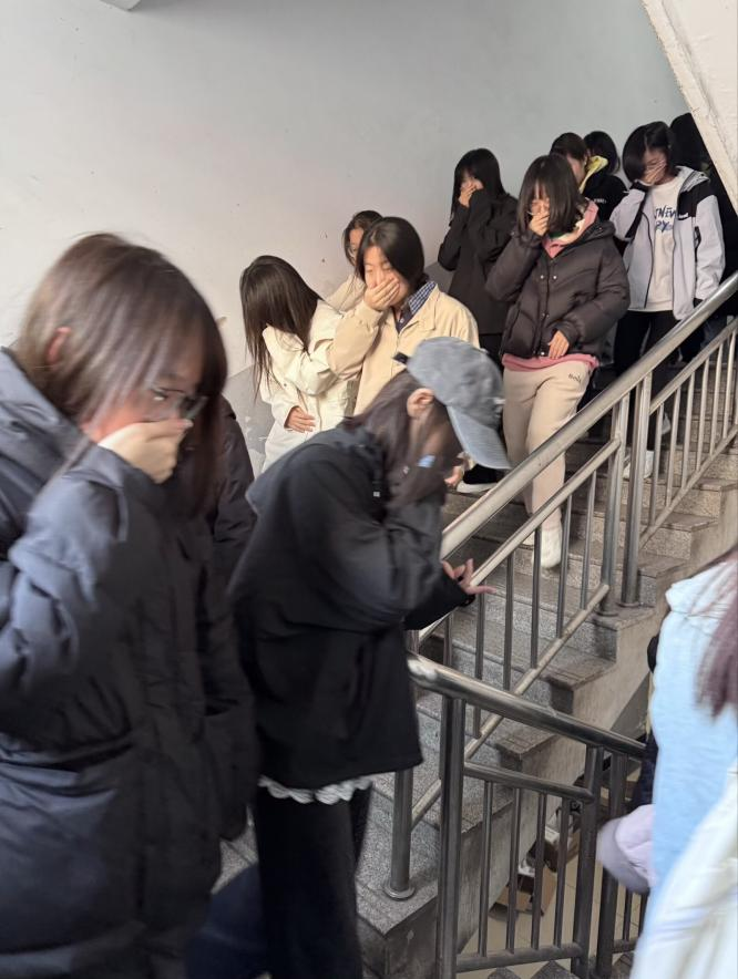 以练为战筑防线 防患未“燃”护平安。活动主持人向学生普及宿舍火灾常见诱因、初期火灾扑救方法、火场逃生技巧等核心知识。为让知识真正落地,模拟“火情”突发,学生们在工作人员的引导下,用手捂住口鼻,弯腰低姿沿宿舍的安全通道快速撤离,全程不推挤、不慌张,从容有序地向指定的篮球场空旷区域集结。