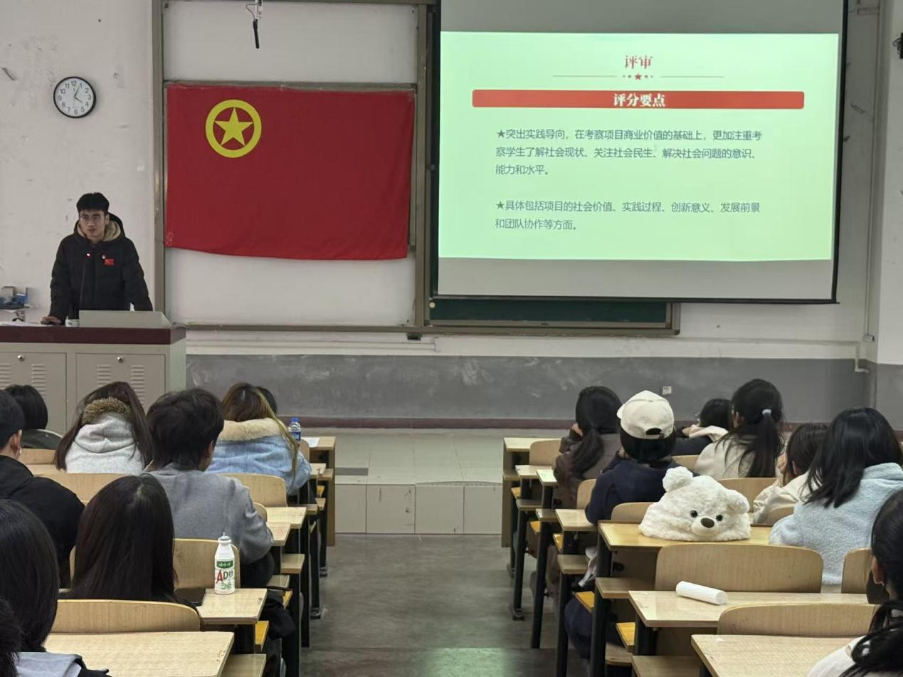 在核心备赛技巧分享环节,23统计杨帆结合自身参赛经历,毫无保留地传授经验。从商业计划书的框架搭建、数据支撑、逻辑梳理,到PPT展示的视觉设计、重点突出、节奏把控,再到答辩环节的临场应变、问题回应技巧,均进行了细致讲解。他特别提醒同学们,要注重团队分工协作,充分发挥不同专业成员的优势,同时关注项目的创新性与落地性,用真实数据和可行方案增强项目说服力。