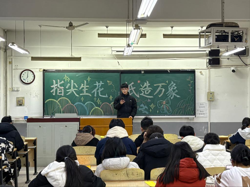 为传承中华优秀传统文化,丰富学生课余生活,锻炼动手实践能力,2025年12月10日,数学与计算科学学院大学生自律委员会于南院2201举办“指尖生花,纸造万象”活动,吸引40余名学生踊跃参与。