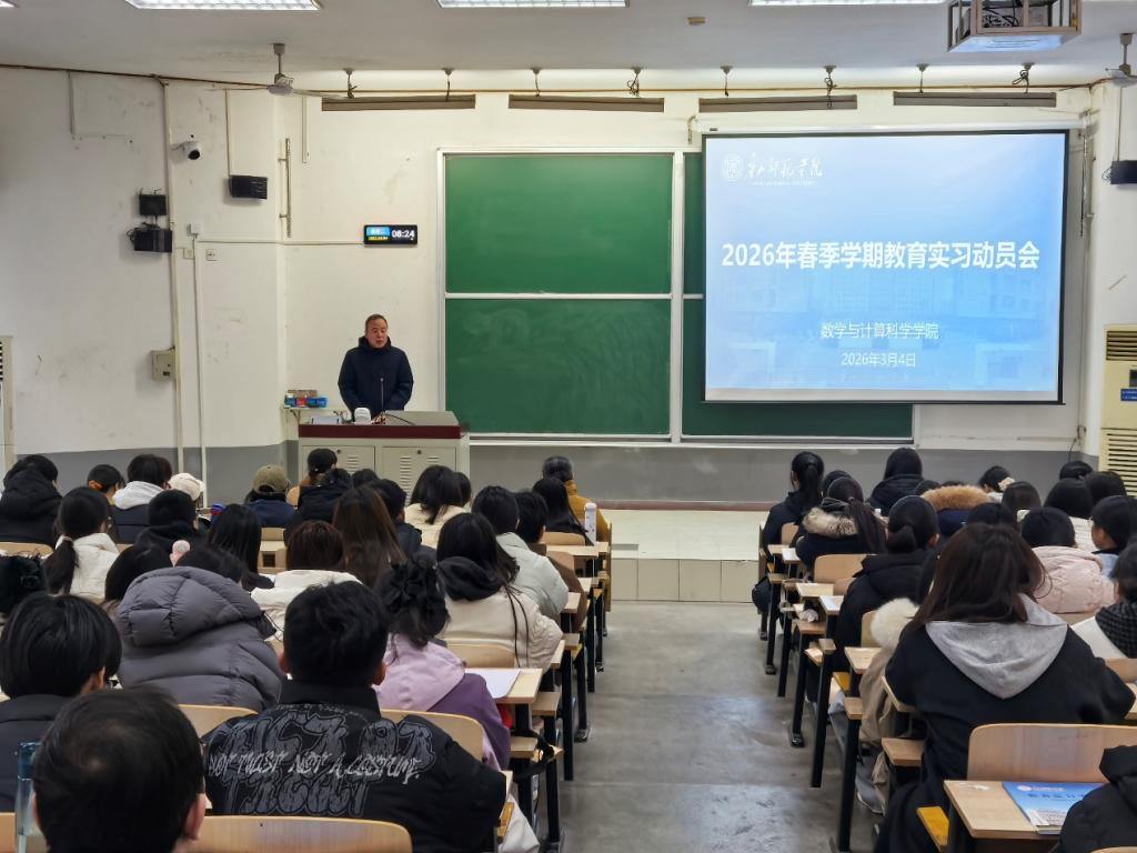 为深化师范生素养培育,推动理论与教学实践深度融合,全面提升人才培养质量,3 月 4 日,数学与计算科学学院在第八阶梯教室召开 2023 级数学师范生暨 2022 级公费师范生 2026 年春季教育实习动员会。学院党总支书记檀艳、院长周庆平、副书记刘梦、副院长刘庆辉及相关班主任王玉真、尹丽云教师出席会议,会议由刘庆辉副院长主持。