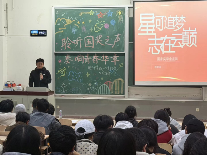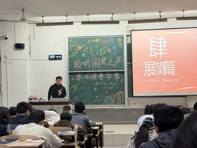 为发挥国家奖学金获得者榜样引领作用,营造优良学风,2026年4月9日,数学与计算科学学院大学生自律委员会与大学生心理协会于南院八阶梯教室,联合举办“聆听国奖之声,奏响青春华章”国家奖学金获得者经验分享会。2024、2025级学生代表共计168人参加本次活动。