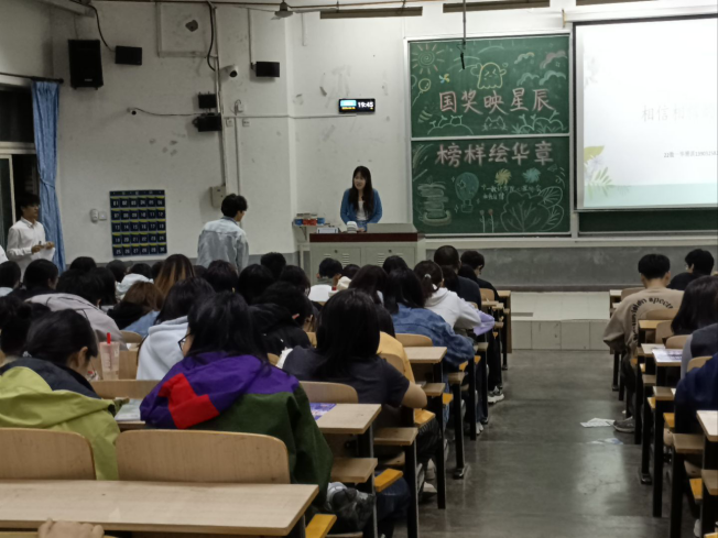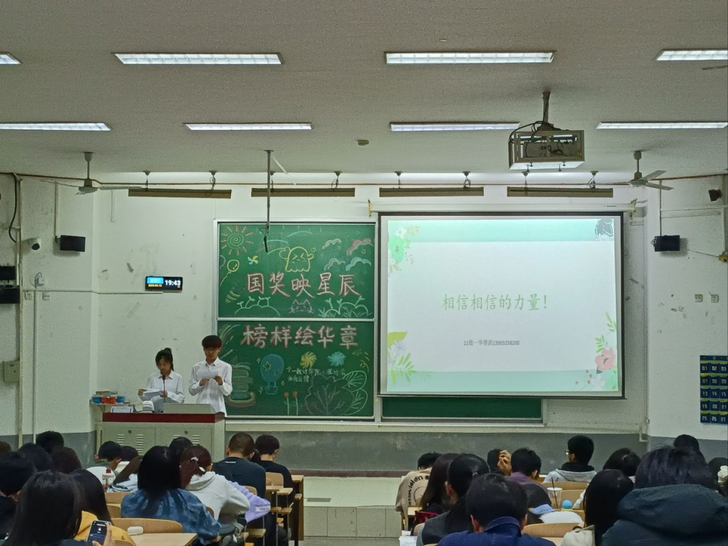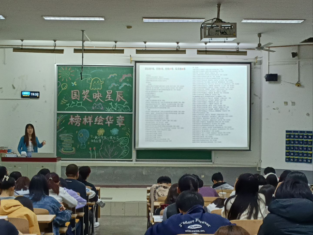 为落实国家奖学金政策育人导向,发挥优秀学子先锋模范作用,厚植学院勤学笃行的优良学风,引导青年学生树立正确学习目标、涵养进取心态。2026年4月15日,数学与计算科学学院大学生心理协会联合大学生自律委员会,在南院六阶梯举办“国奖映星辰,榜样绘华章”国家奖学金获得者经验分享会。2024、2025级师范班共计167名学生代表参会。