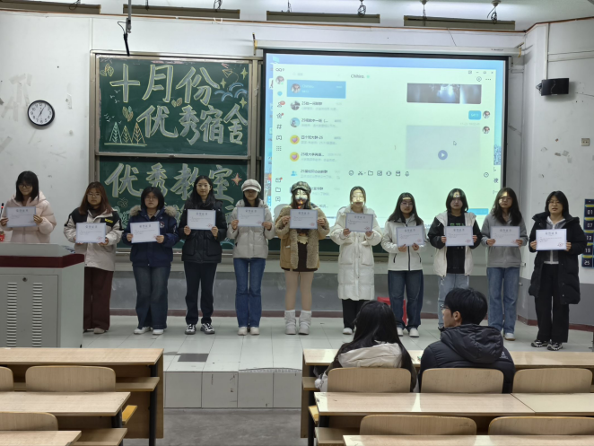 为深入推进劳动教育与校园文化建设深度融合,引导学生以宿舍文化建设为抓手践行文明风尚,为校园精神文明建设注入青春力量。2025年11月23日,数学与计算科学学院大学生自律委员会于南院六阶梯教室举办“10月份优秀宿舍和优秀教室”评选表彰活动。2025级优秀宿舍成员、优秀教室代表以及各班生活委员共计87名学生参与。
